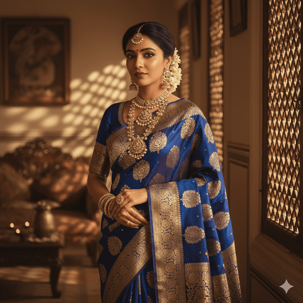 Prompt: Indian girl wearing royal blue Banarasi saree with heavy zari work, antique jewelry, cinematic indoor light, regal Indian aesthetic.