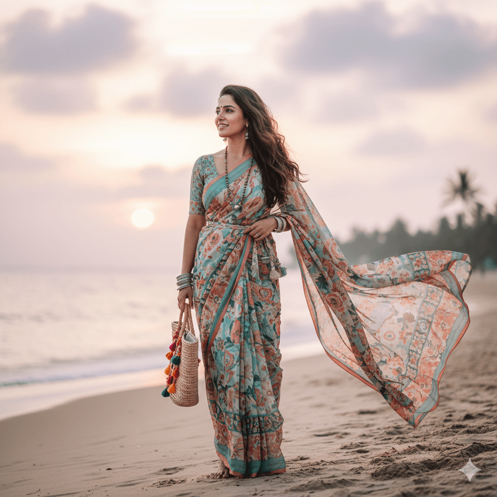 Prompt: Indian girl in boho-style printed saree, beach background, soft pastel sunset sky, relaxed aesthetic vibe.