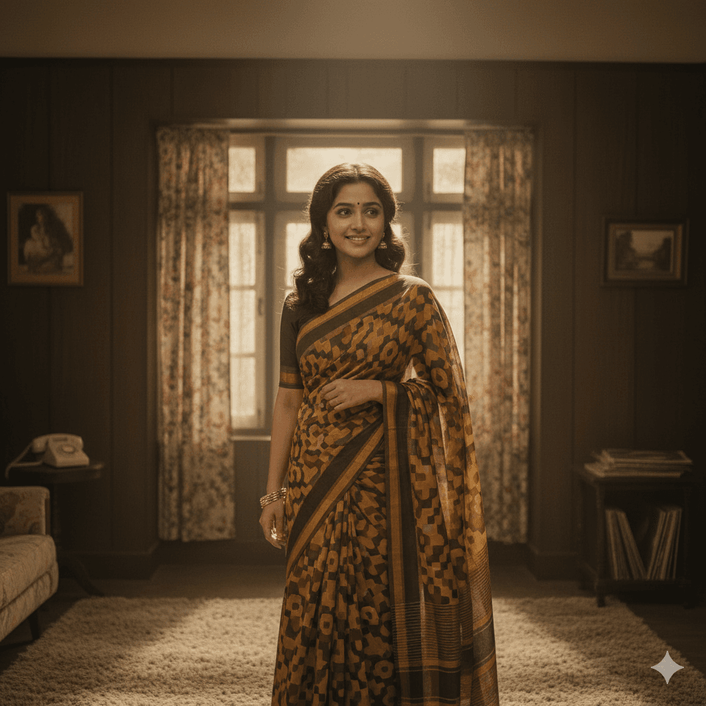 Prompt: Indian girl in retro printed saree, soft grain film tones, vintage indoor setting, nostalgic aesthetic.