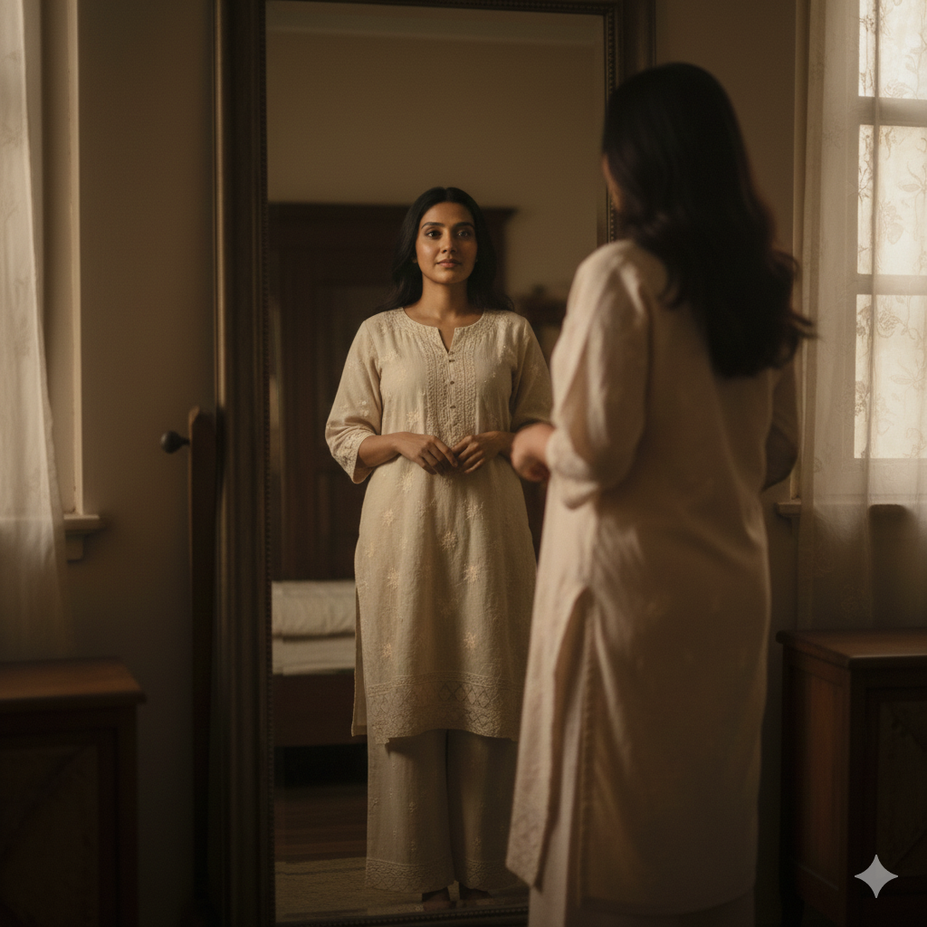 Indian girl standing in front of a mirror in a dimly lit room, soft warm light reflecting, wearing ethnic fusion outfit, calm expression, cozy indoor vibe, cinematic and aesthetic photography