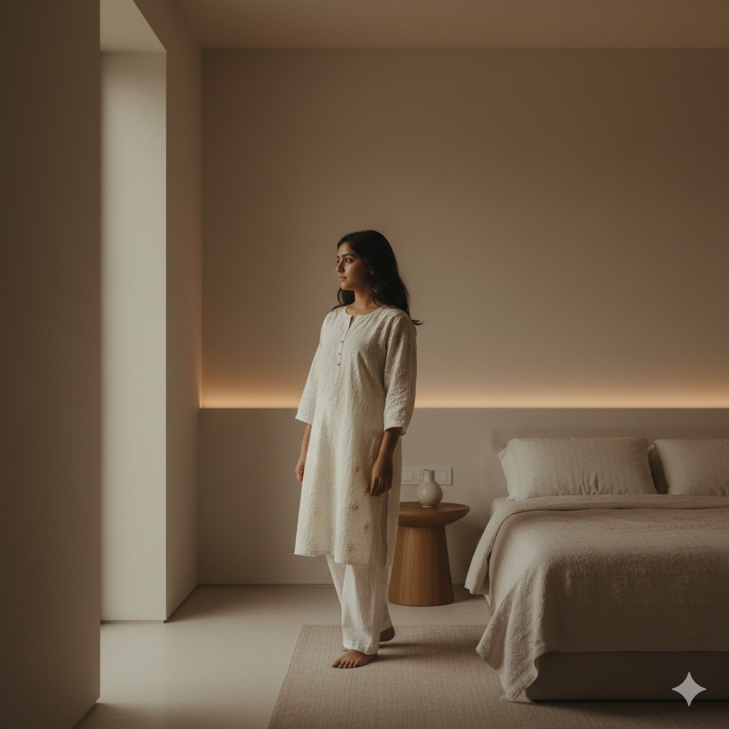 Indian girl standing in a minimalist bedroom with neutral color walls, low lighting, soft shadows, wearing simple ethnic wear, natural skin tones, relaxed posture, cozy and modern indoor aesthetic, professional cinematic photography