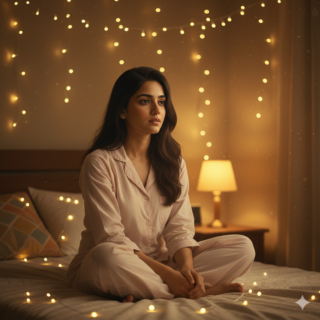 Indian girl sitting on her bed in a softly lit bedroom, warm bedside lamp glowing, fairy lights in the background, wearing an oversized sweater, relaxed posture, warm brown and beige tones, cozy indoor vibe, low-light photography, aesthetic and cinematic mood