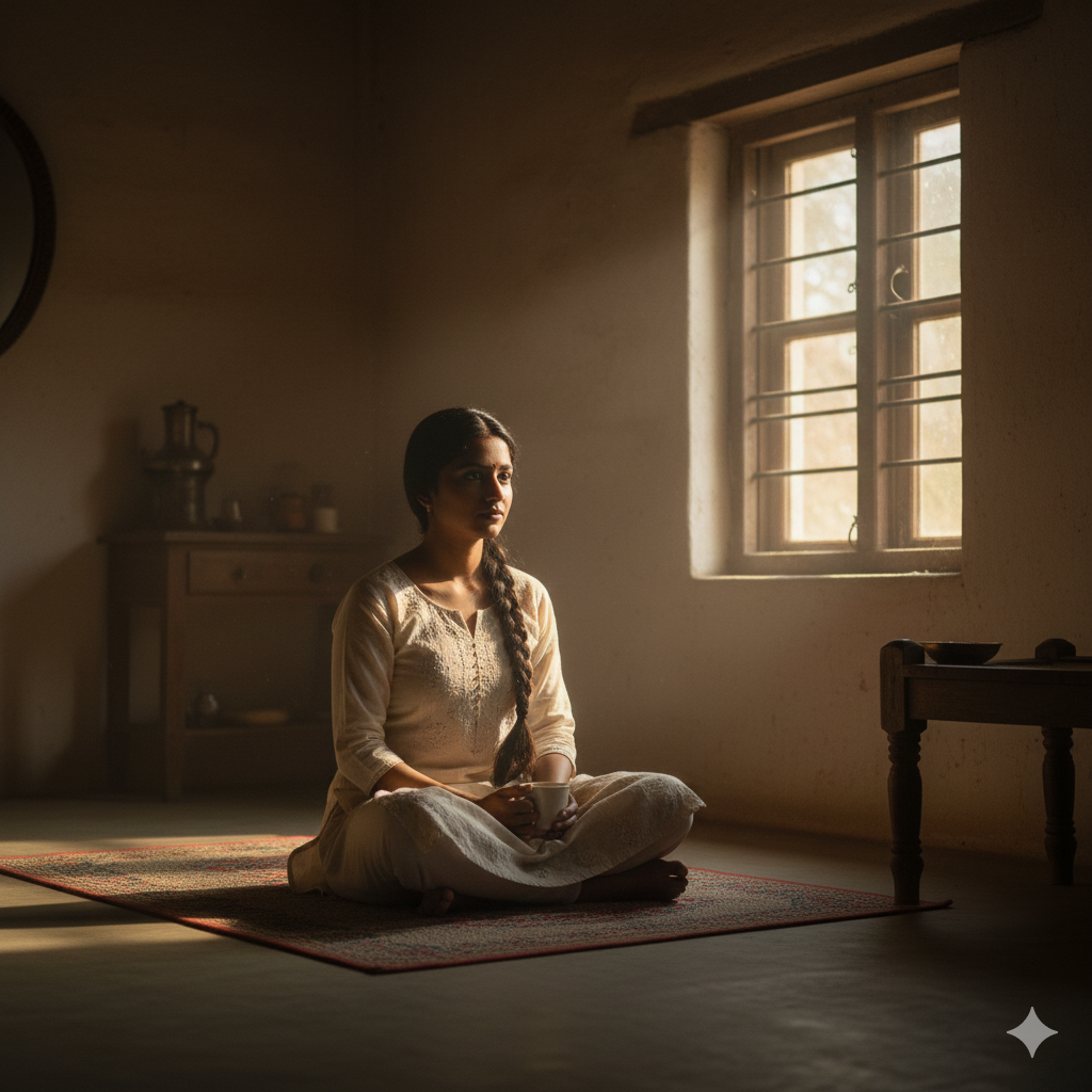 Indian girl sitting cross-legged on a rug indoors, surrounded by cushions, dim ambient lighting, wearing a simple kurti and dupatta, soft lamp glow, warm tones, peaceful indoor aesthetic, cinematic low-light photography