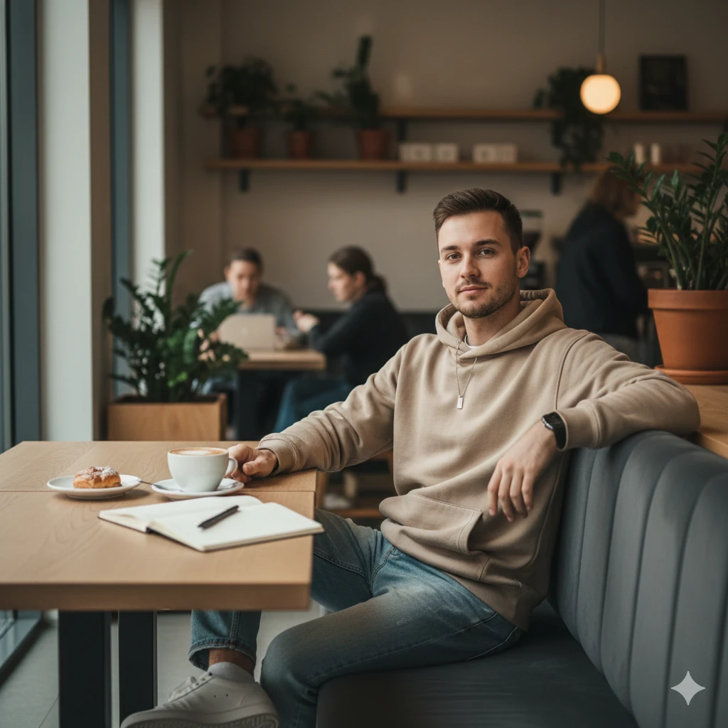 A stylish boy wearing a beige hoodie and jeans, sitting in a modern coffee shop, natural window light, relaxed expression, candid photography style, realistic colors, high resolution