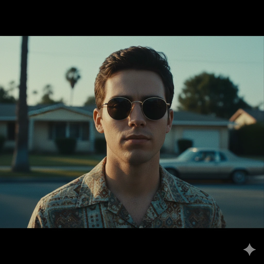 A young man wearing retro sunglasses and classic shirt, 90s vintage color grading, soft film grain, nostalgic mood, cinematic portrait, ultra realistic style