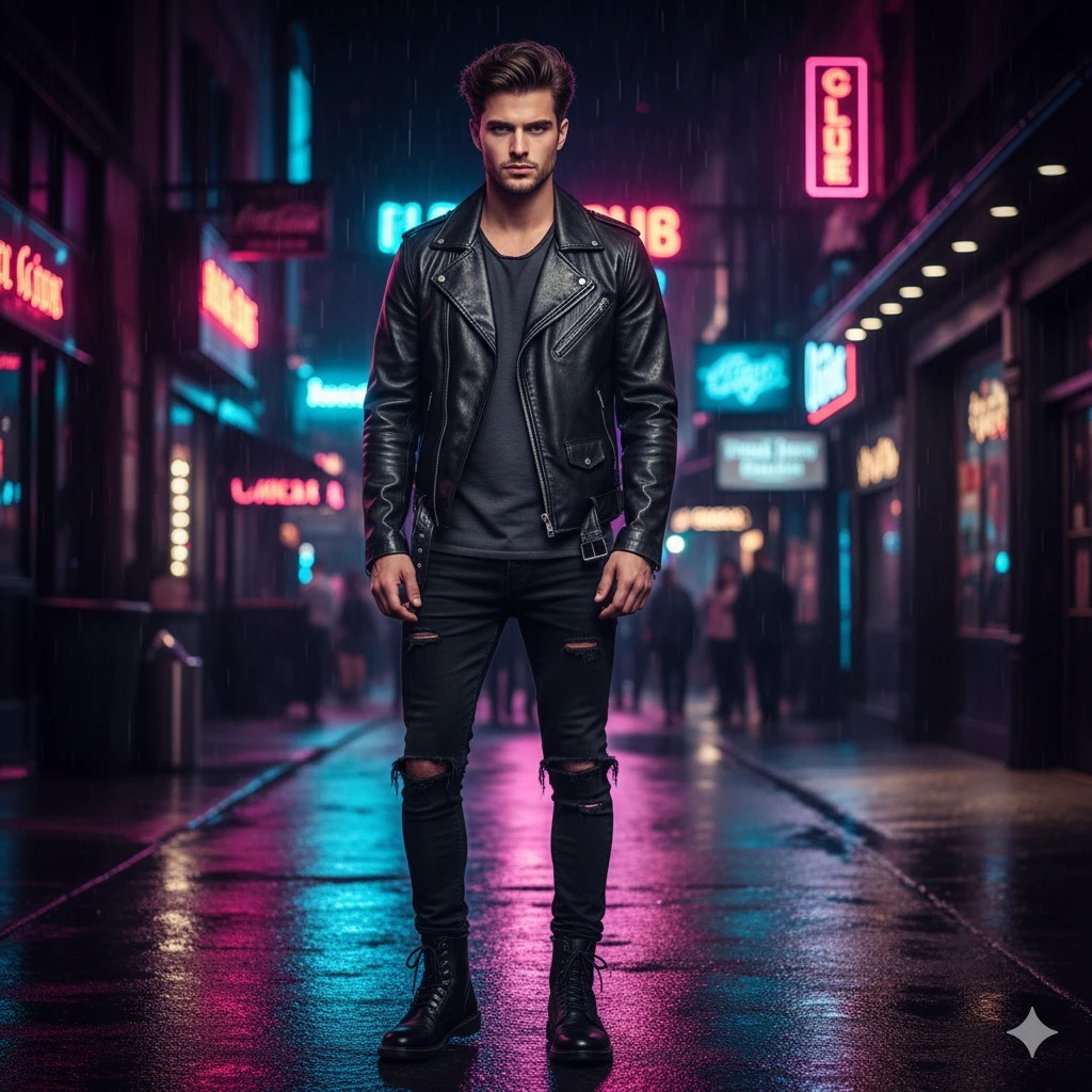A trendy boy wearing a leather jacket, standing outside a nightclub, colorful neon lights, confident pose, fashion editorial style, cinematic contrast, realistic texture