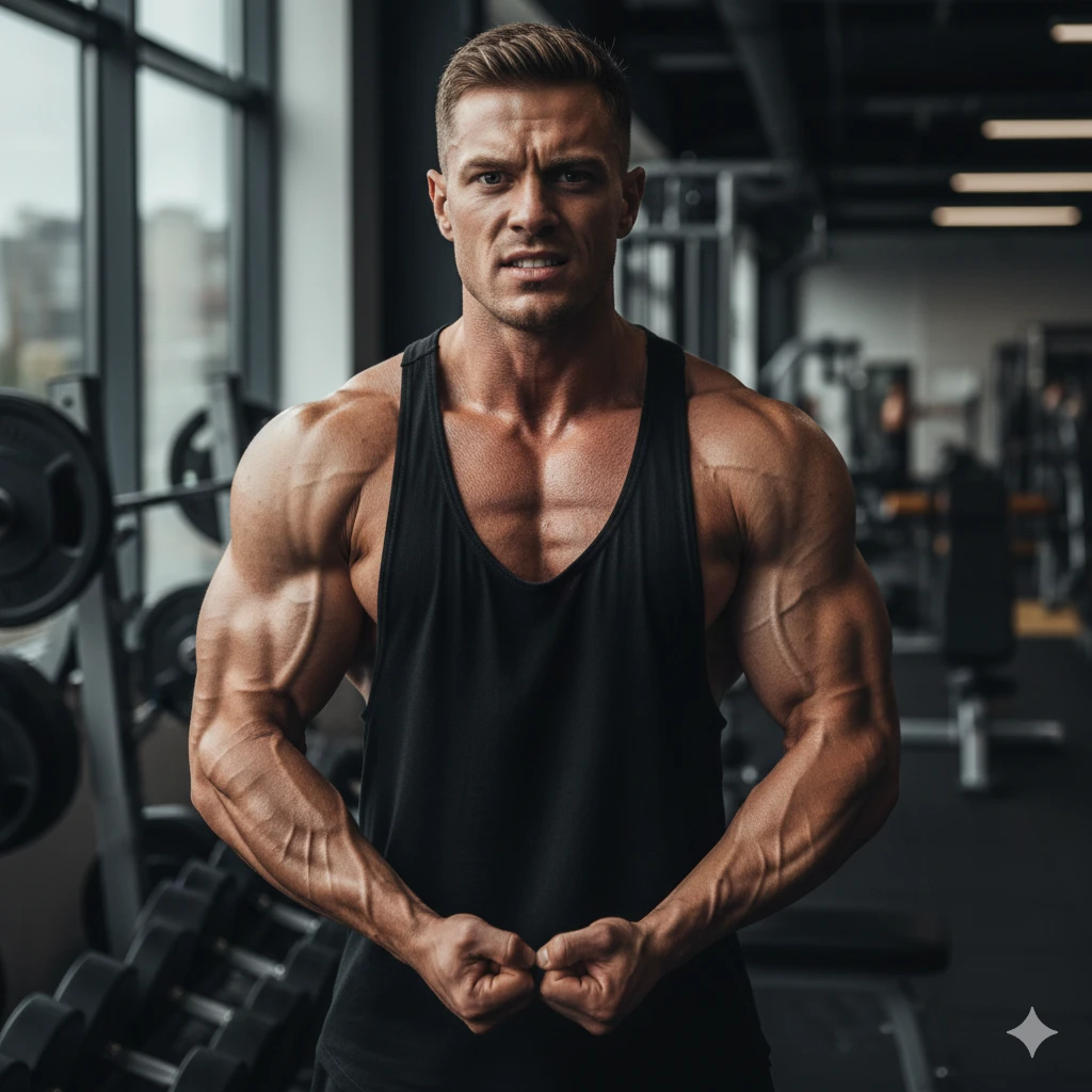 A fit athletic man wearing a sleeveless gym vest, muscular build, standing in a gym with soft side lighting, sweat details, intense expression, ultra HD fitness photography