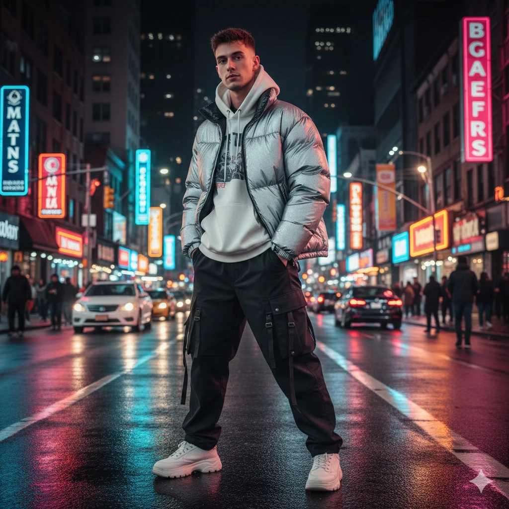A confident young man wearing oversized streetwear, black cargo pants, white sneakers, standing on a busy urban street, neon lights in background, cinematic night lighting, realistic skin texture, ultra HD, DSLR photography