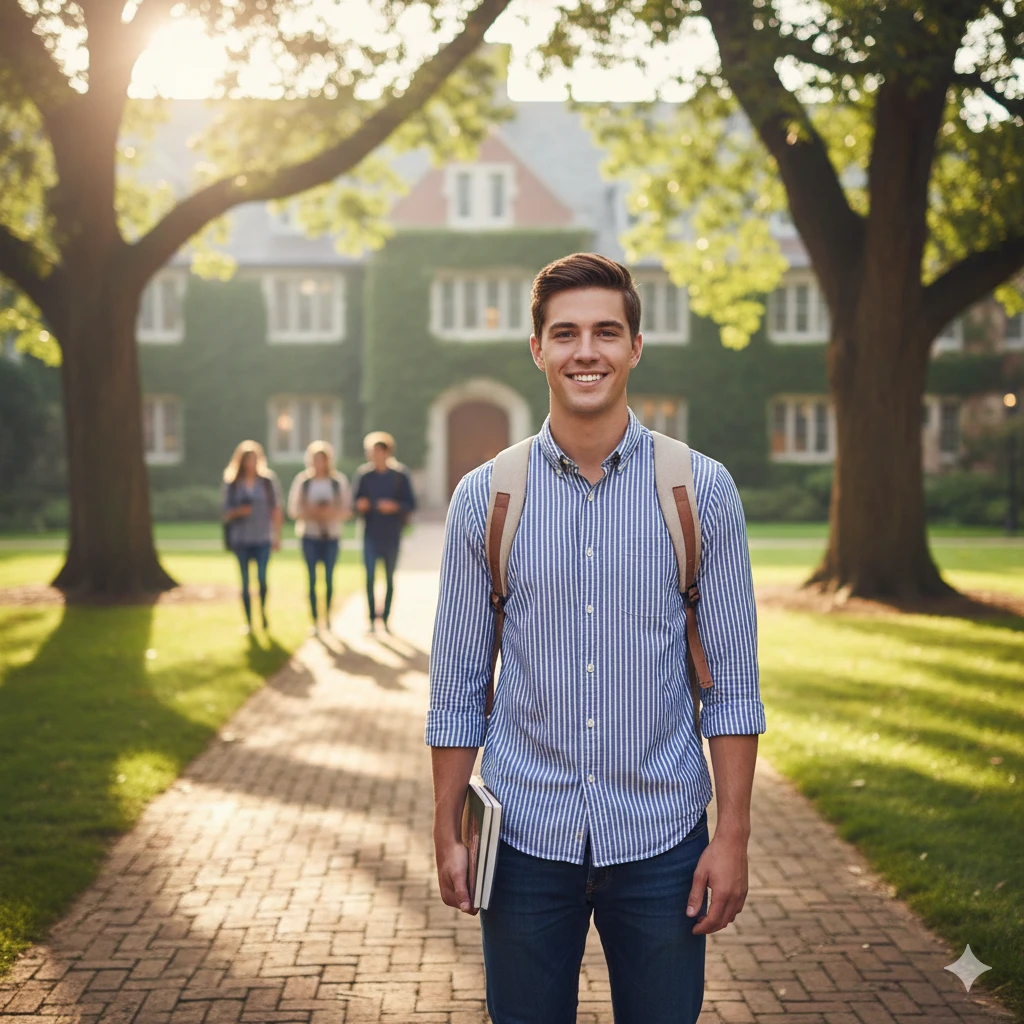 A smart college boy wearing a backpack and casual shirt, standing on a campus pathway, morning sunlight, natural smile, realistic lifestyle photography, high quality