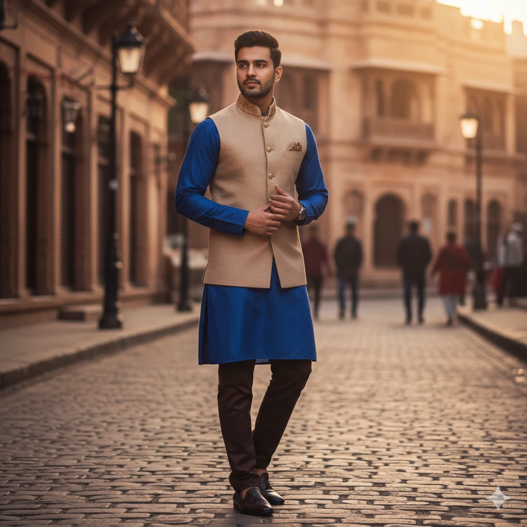 A young Indian man wearing a modern kurta with jacket, standing on a heritage street, golden hour sunlight, cultural yet trendy look, cinematic tones, ultra realistic photo