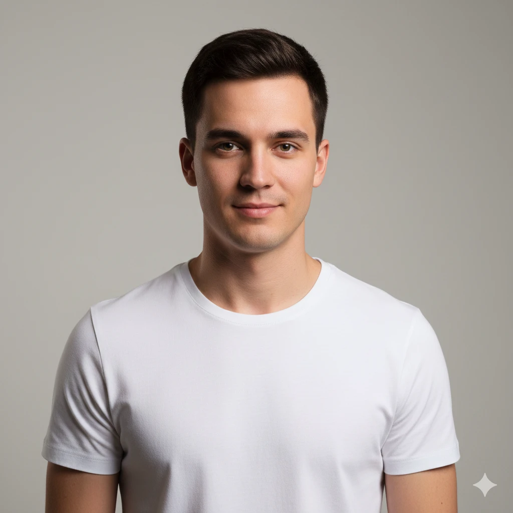 A clean studio portrait of a young man wearing a plain white t-shirt, neutral background, softbox lighting, sharp facial details, professional photography look, ultra HD