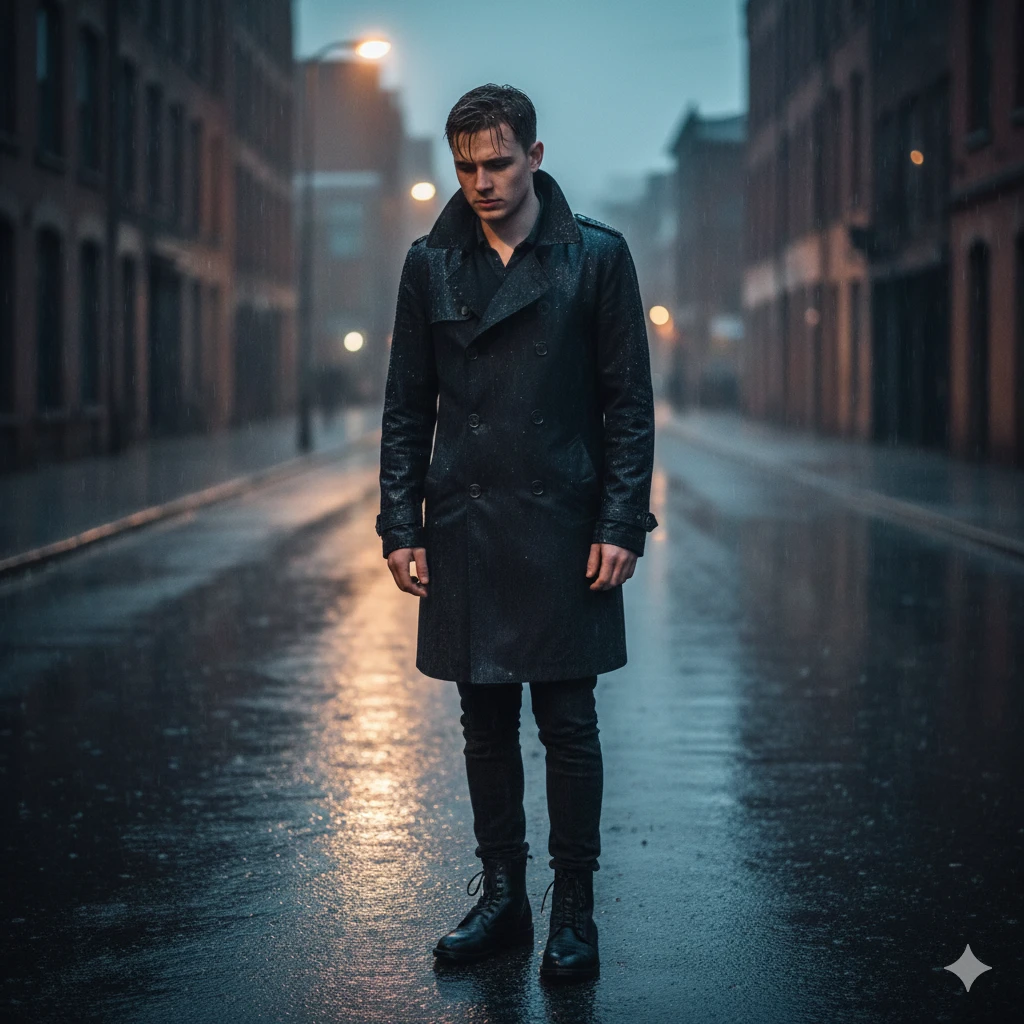 A boy wearing a dark trench coat, standing in light rain on an empty road, moody cinematic lighting, reflections on ground, emotional expression, high realism, 4K photo