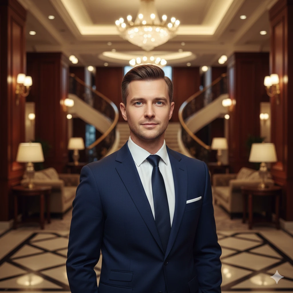 A handsome man in a tailored navy blue suit, clean haircut, standing inside a luxury hotel lobby, soft warm lighting, professional corporate look, shallow depth of field, 4K realistic portrait