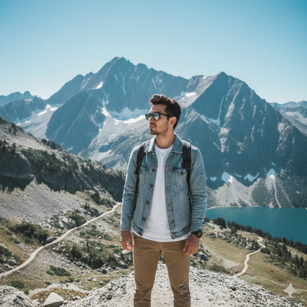 A stylish traveler wearing sunglasses and a denim jacket, standing near mountains, bright natural daylight, adventurous mood, wide angle shot, Instagram-style photography