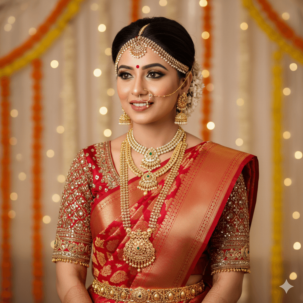 “Stunning Indian bride in heavy bridal saree, gold bridal jewelry, bindi, maang tika, glowing skin, wedding background, highly detailed ultra-realistic bridal portrait.”