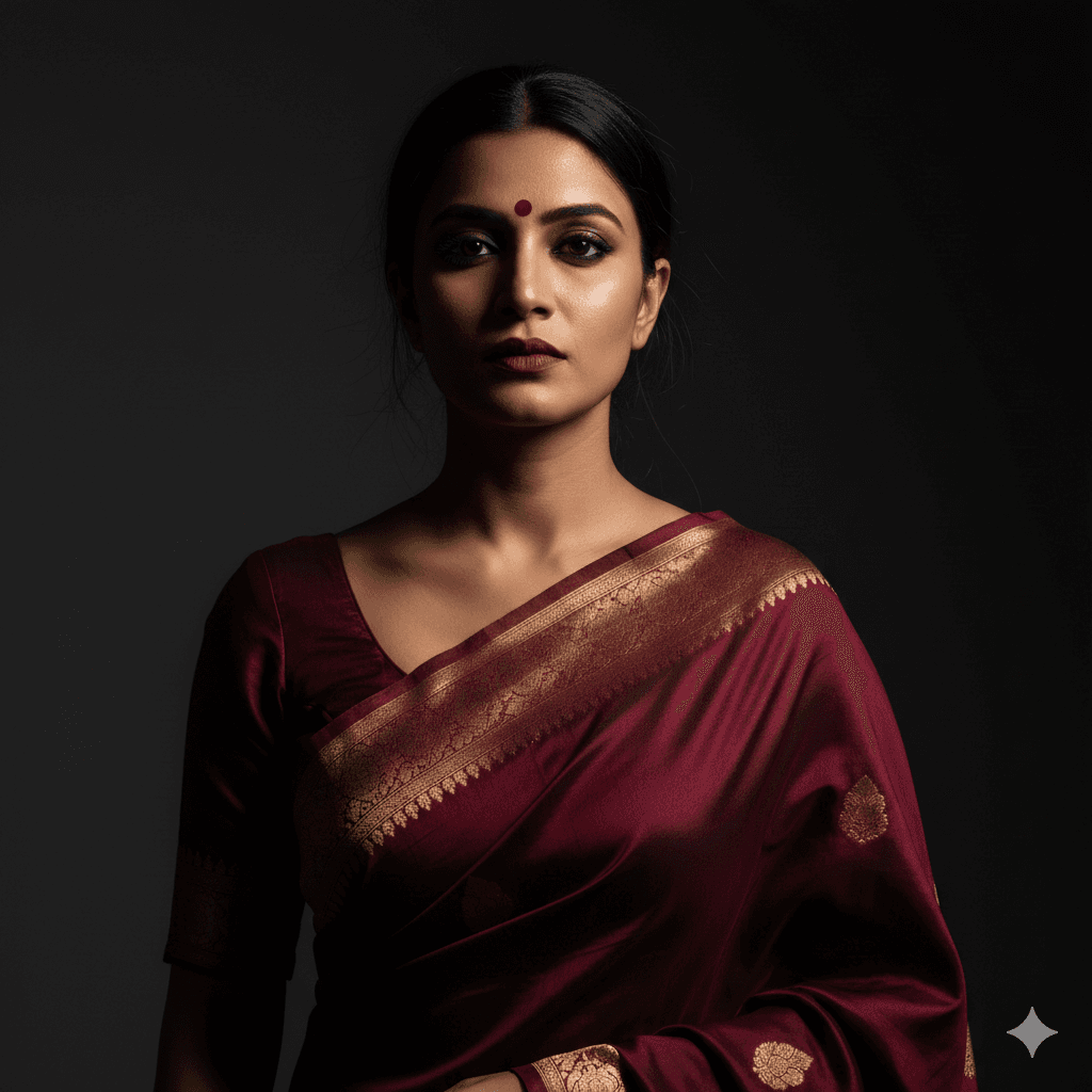 “Indian woman in a dark maroon saree, cinematic lighting, dramatic shadows, intense eyes, dark studio background, ultra-realistic 4K portrait.”