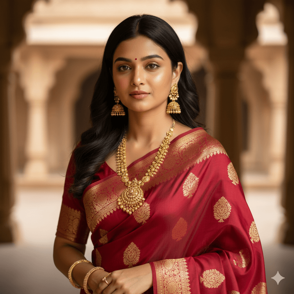 “Indian woman in a red Banarasi saree with golden zari work, elegant gold jewelry, soft glam makeup, cultural Indian backdrop, cinematic lighting, sharp 4K portrait.”