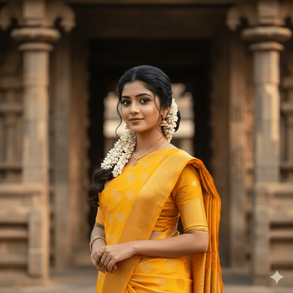 “South Indian girl in bright yellow Kanchipuram saree, jasmine flowers in hair, temple background, natural lighting, traditional pose, high-detail portrait.”