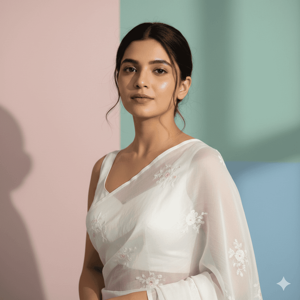 “Girl wearing a soft white chiffon saree, minimal makeup, clean pastel background, soft shadows, aesthetic portrait style, ultra-clear HD image.”