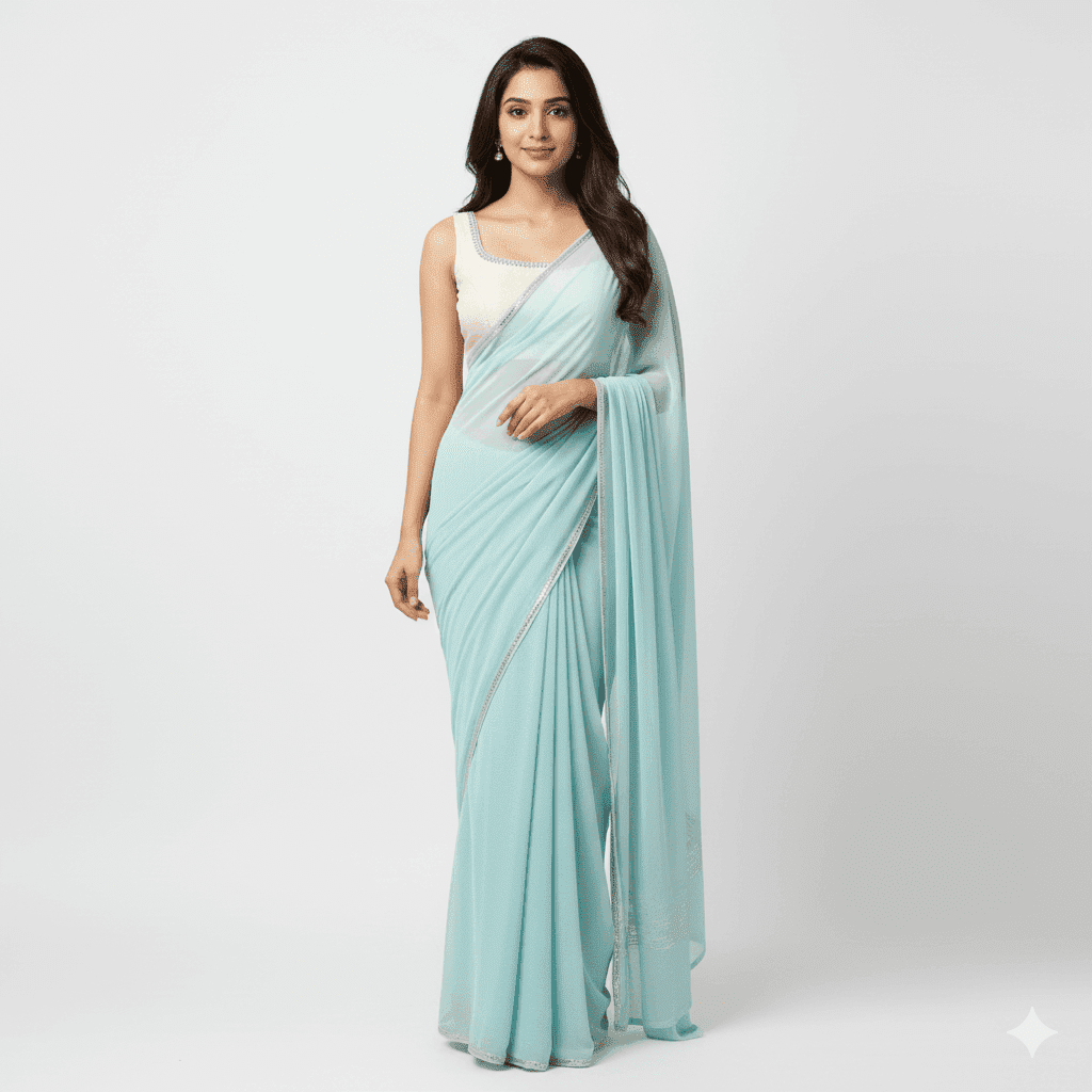 “Young Indian girl in a modern chiffon saree, stylish blouse, studio lighting, minimal makeup, fashion photoshoot style, clean background, 4K HD portrait.”