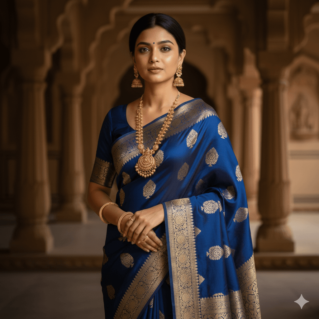 “Elegant Indian woman in royal blue Kanjeevaram saree, golden antique jewelry, palace background, deep rich colors, dramatic lighting, royal theme portrait.”