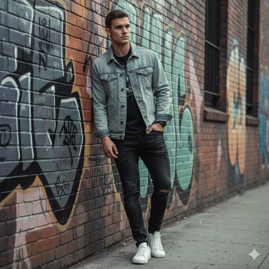 Young man leaning against a graffiti wall, casual street-style outfit, natural ambient light, shallow depth of field, realistic skin tones, slightly desaturated cinematic editing.