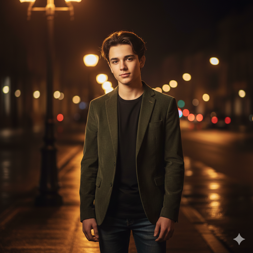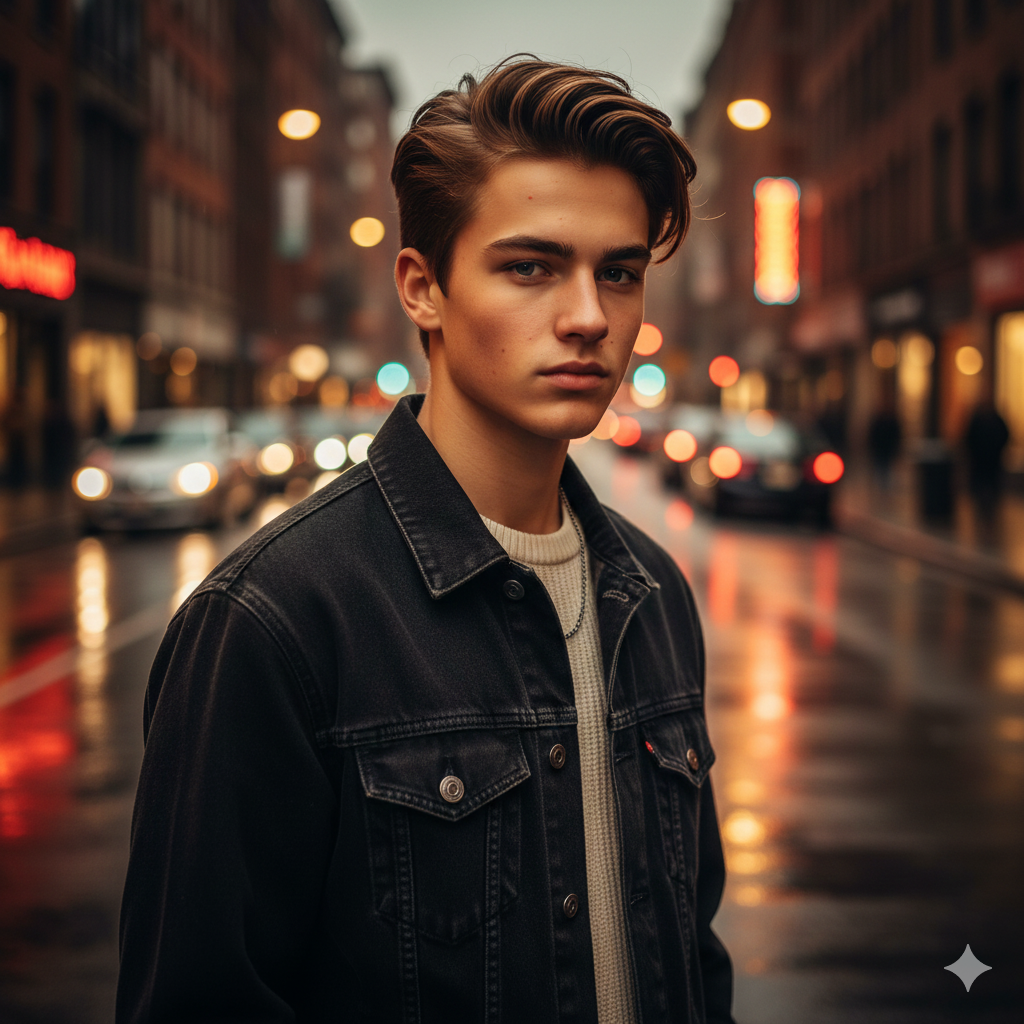 Cinematic 4K portrait of a stylish teenage boy standing in soft street lighting, natural skin texture, confident expression, shallow depth of field, warm tones, fashion-editorial style.