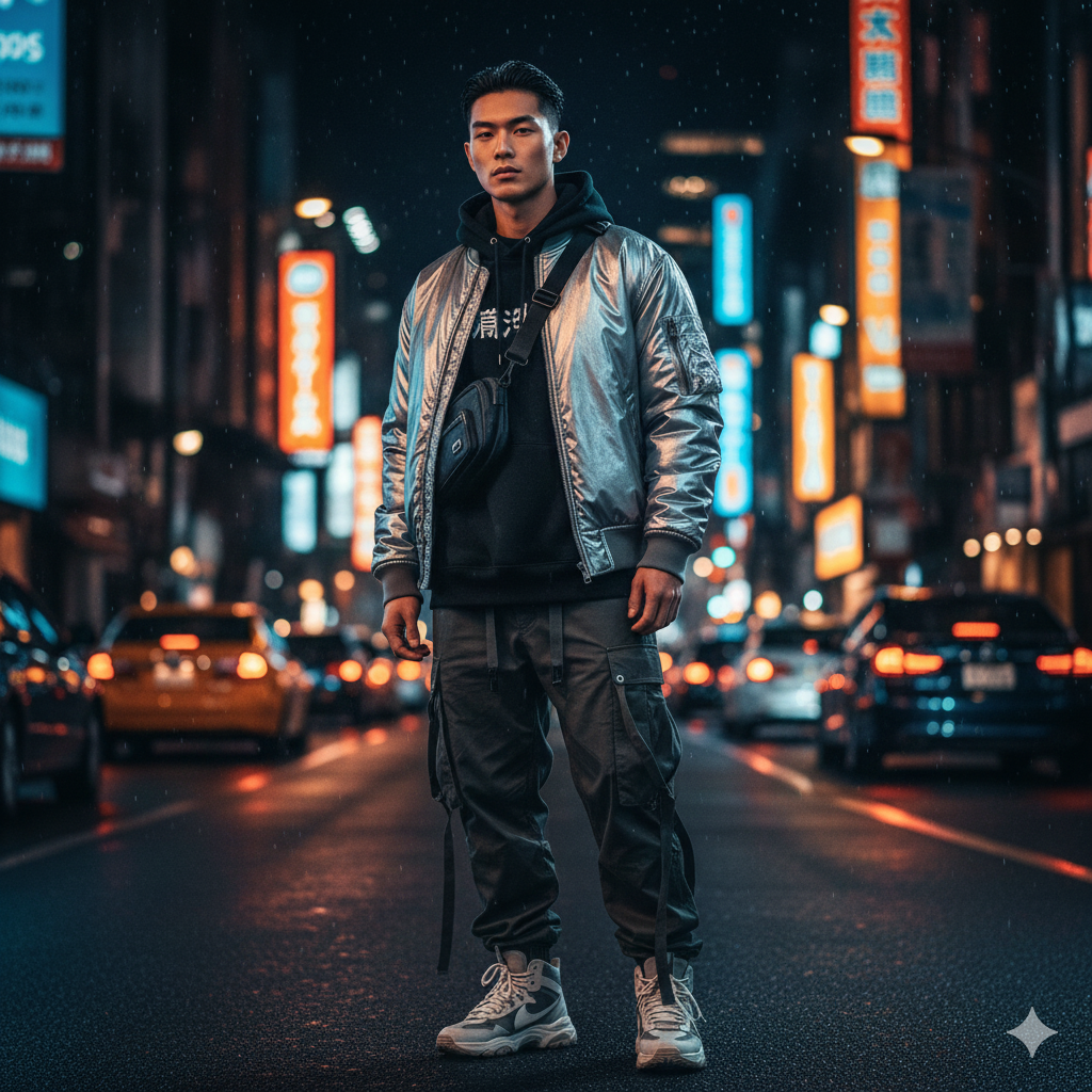 Ultra-realistic 8K portrait of a young man in streetwear, city background, cinematic lighting, shallow bokeh, sharp focus, realistic skin tone, urban mood.
