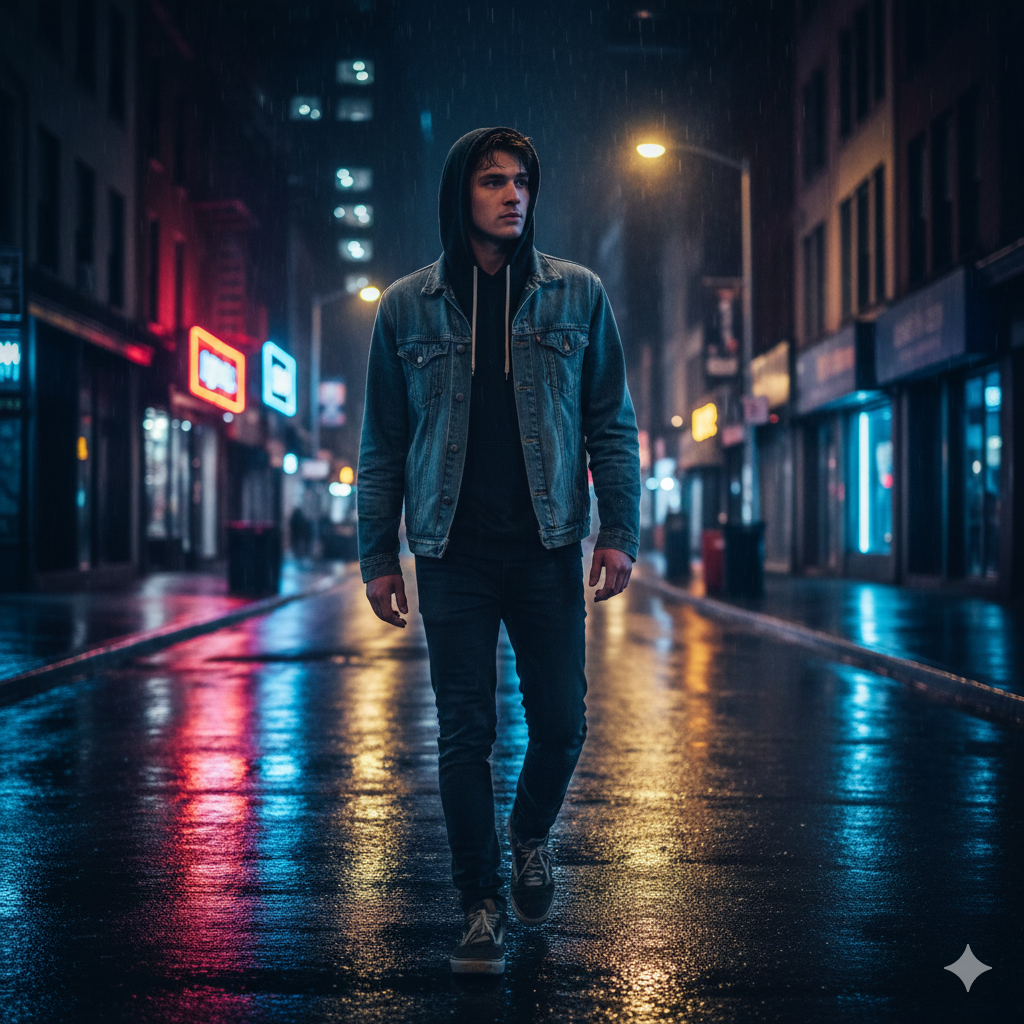 Cool boy with hoodie and denim jacket walking down a city street at night, neon lights reflecting off wet pavement, moody expression, cinematic 4K photography style.