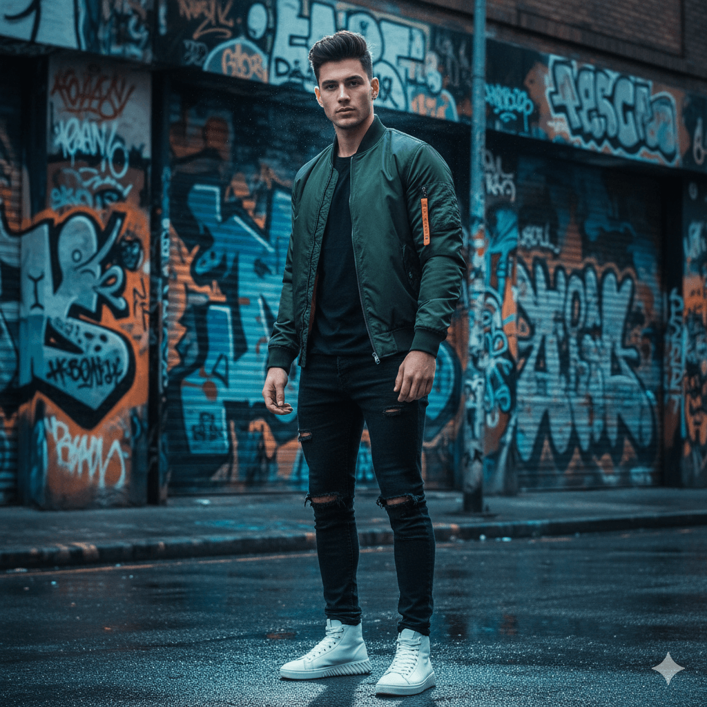 Prompt: A handsome young man with a stylish jacket and sneakers, standing on a vibrant graffiti-covered street. Urban fashion photoshoot, 4K, hyperrealistic, trending on Instagram.