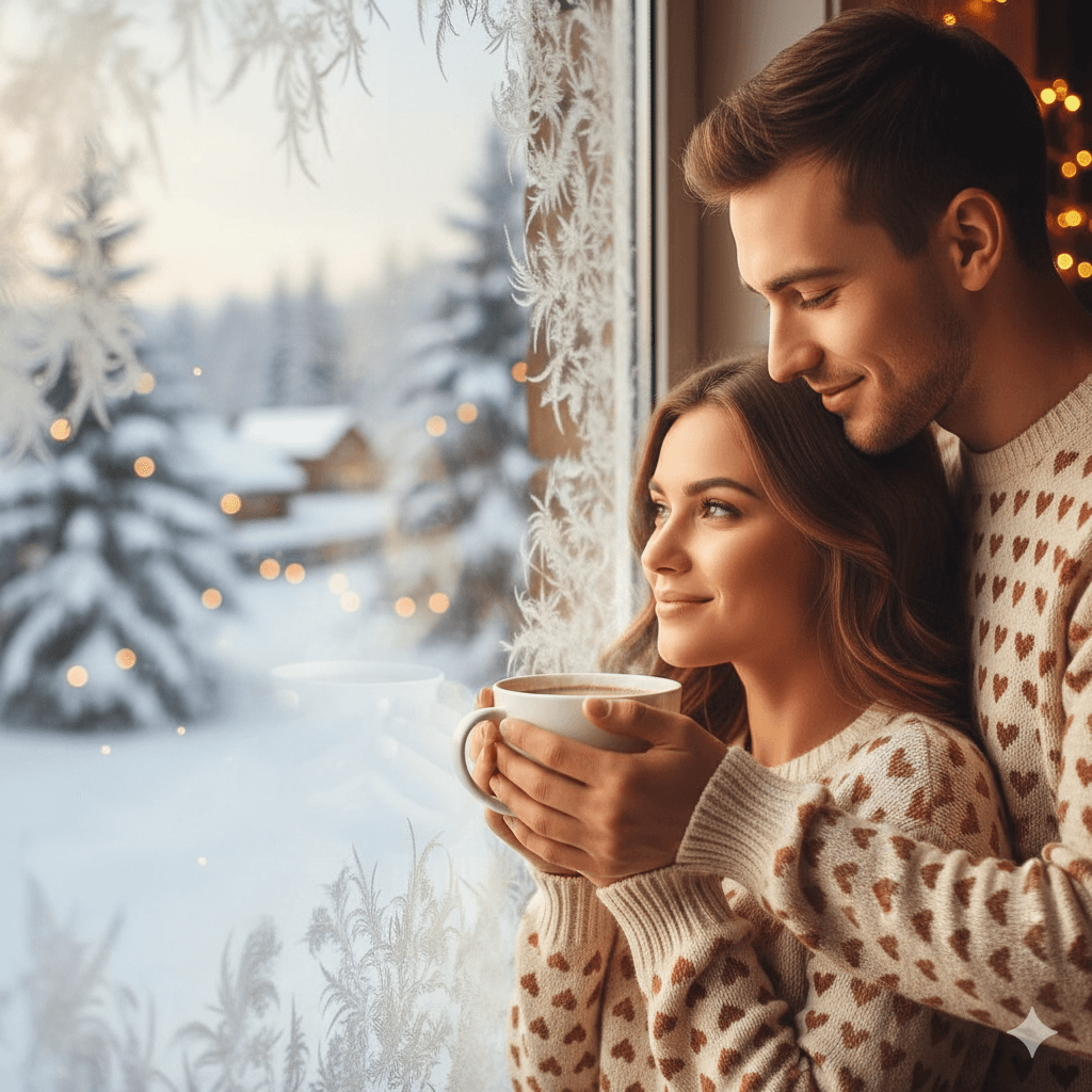 Prompt: A cute couple wearing matching sweaters, sharing a hot chocolate next to a frosty window with snow outside. Intimate, soft focus, romantic, viral couple goals.