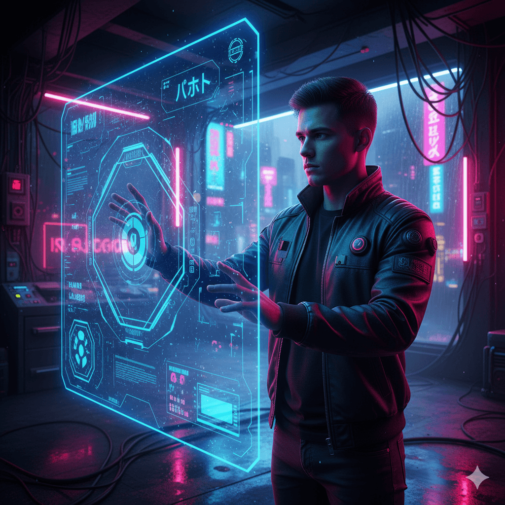 Prompt: A modern guy in a sleek jacket interacting with a holographic AI interface in a neon-lit room. Cyberpunk vibe, futuristic, sharp 4K render.