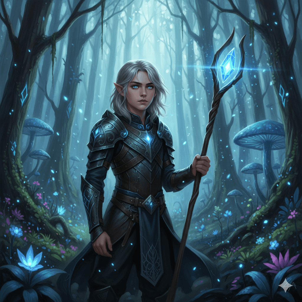Epic digital painting of a young elven boy mage, age 14, with silver hair and glowing blue eyes. He's standing in a bioluminescent forest, holding a staff with a crystalline focus. Wearing intricate leather armor with glowing runes. Magical particles floating in the air, ethereal lighting, fantasy art, trending on ArtStation.