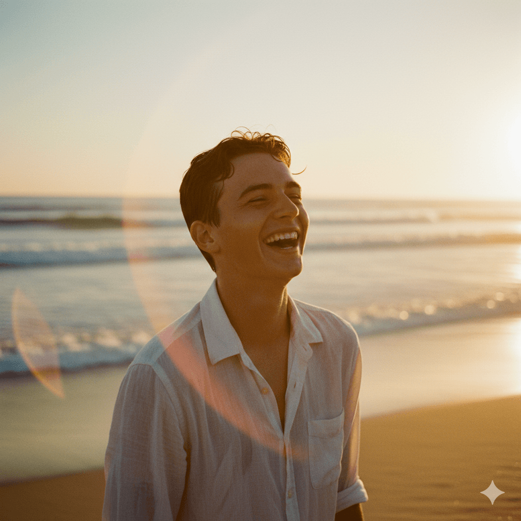 A nostalgic 35mm film photograph of a happy teenage boy, age 16, laughing on a sunny beach at golden hour. He's wearing a simple linen shirt, slightly wet from the ocean waves. Sun flare, grainy texture, warm tones, candid moment.