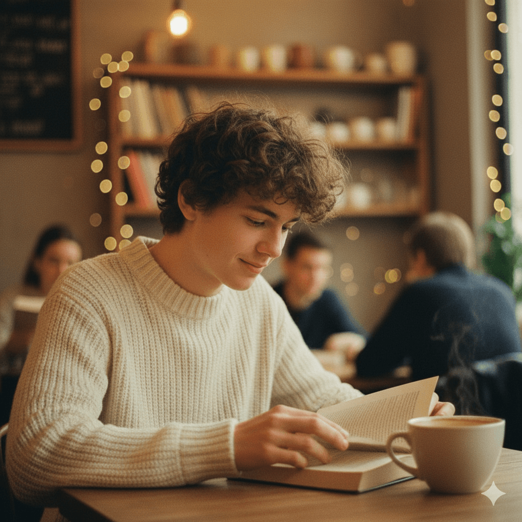 A soft, aesthetic film photo of a gentle-looking boy, age 17, with curly brown hair, reading a book in a cozy cafe. He's wearing a thick, chunky knit sweater. Soft focus, warm ambient lighting, steaming cup of coffee on the table, peaceful and serene mood.
