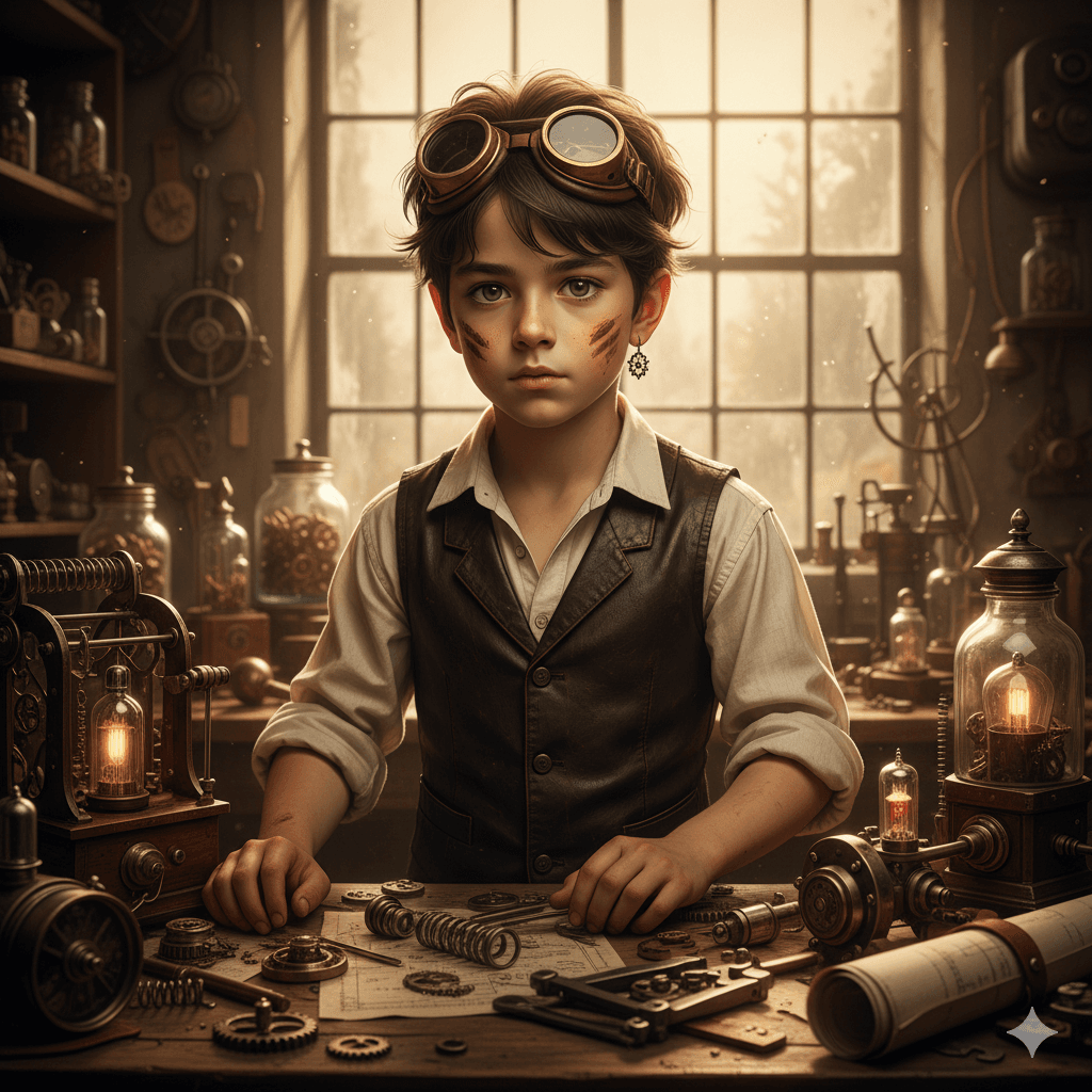 A detailed character portrait of a brilliant steampunk boy inventor, age 15, in his cluttered workshop. He's wearing brass goggles on his forehead, a leather vest over a white shirt, and has grease smudges on his cheek. Surrounded by intricate clockwork gadgets and blueprints, warm golden hour light streaming through a window.