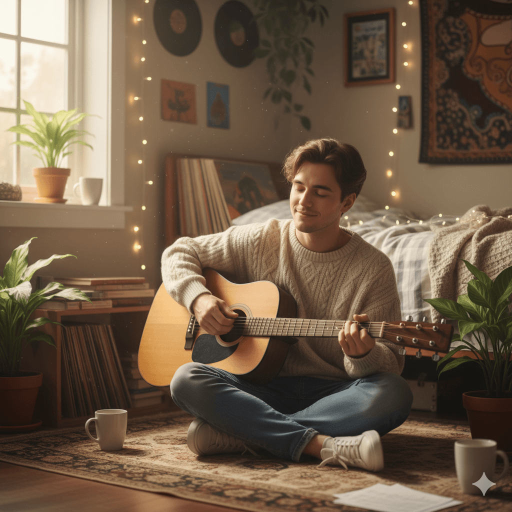 An intimate portrait of a creative boy, age 18, in his bedroom. He's sitting on the floor, strumming an acoustic guitar. The room is filled with plants, vinyl records, and fairy lights. Soft morning light, shallow depth of field, authentic and personal vibe.