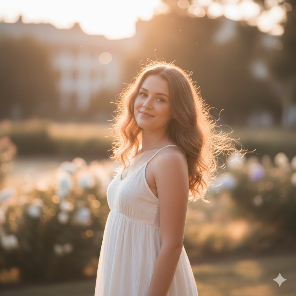 Prompt:A young woman standing in sunlight during golden hour, soft breeze touching her hair, cinematic lighting, DSLR depth-of-field, realistic skin tone, warm glow on face, aesthetic background with bokeh lights, natural smile, soft pastel colour tone — trending Instagram photo style.