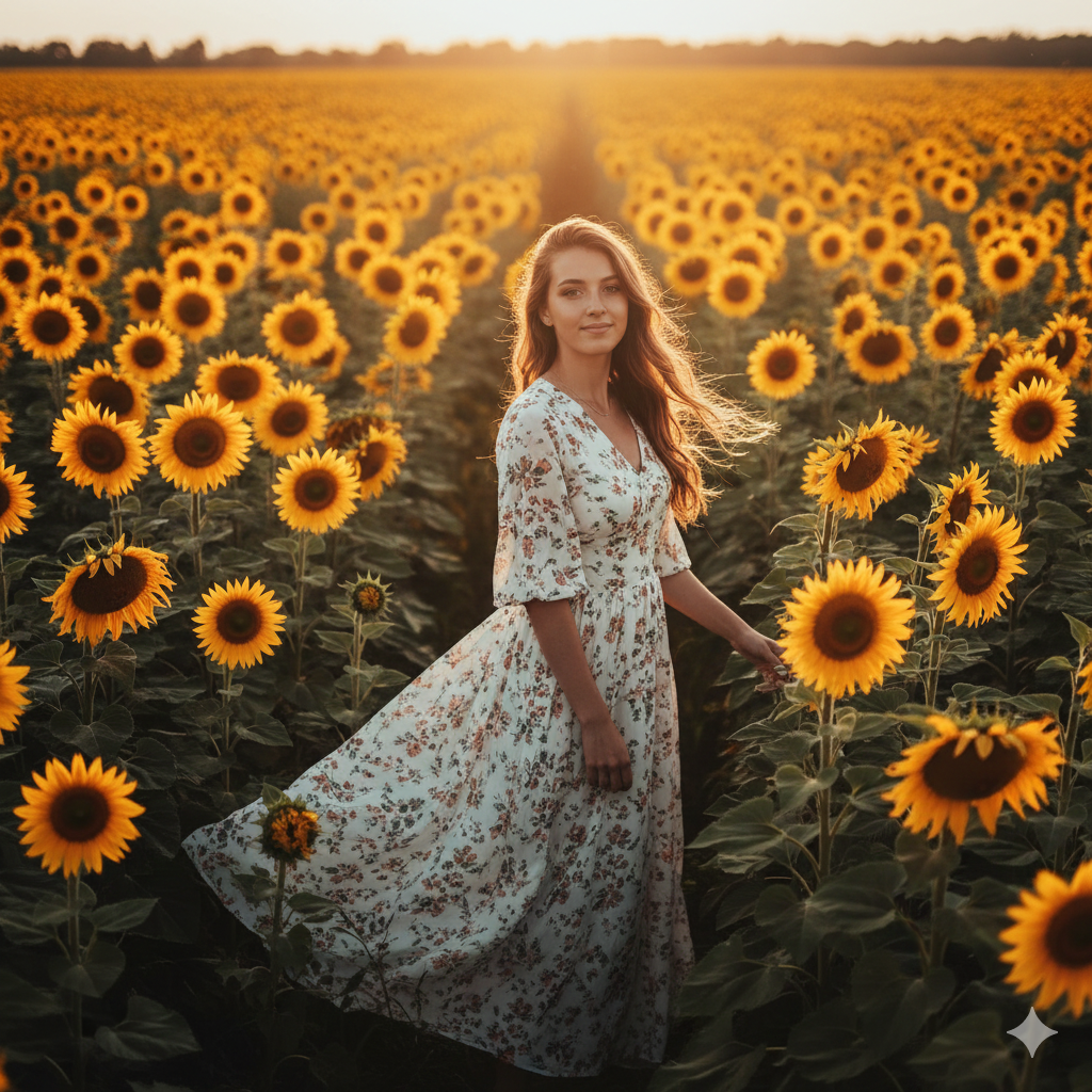 Prompt:A girl in a long white floral dress standing in a sunflower field during golden hour, warm sunlight, cinematic colour grading, dreamy atmosphere, wide-angle shot, gentle wind in hair, realistic skin tone, natural smile, peaceful and aesthetic vibe.