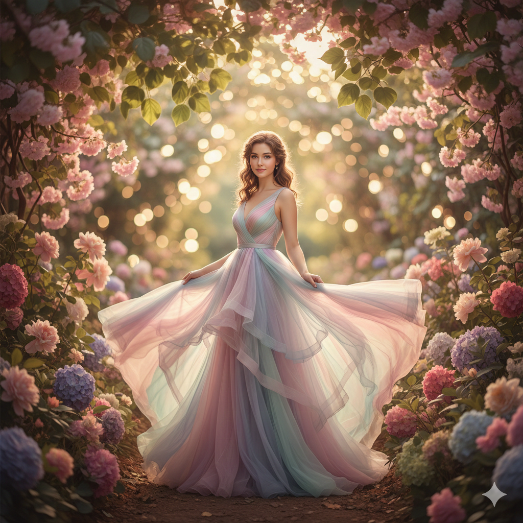 Prompt:Girl wearing a pastel-coloured flowy dress, surrounded by blooming flowers in a garden, soft sunlight filtering through leaves, shallow depth-of-field, dreamy bokeh, gentle smile, pastel-toned cinematic portrait, Instagram aesthetic.