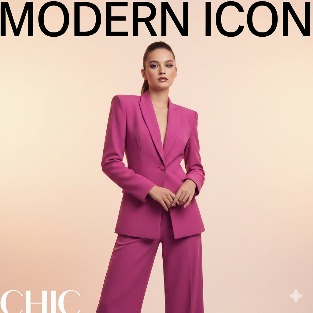 Prompt:A high-fashion editorial-style portrait: a young woman in a tailored pantsuit in bold colours (like fuchsia pink), professional posture, studio background with soft lighting, confident look — modern, chic, magazine-cover vibe.