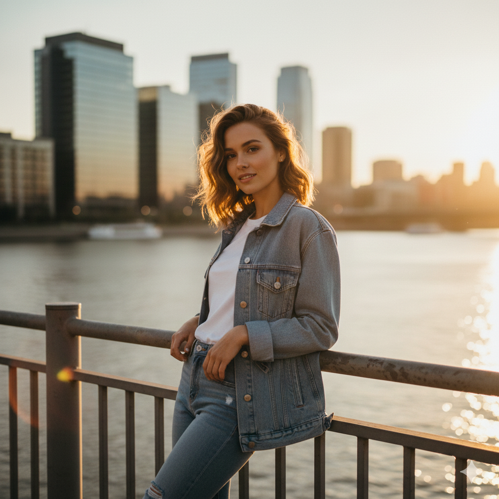 Prompt:<strong>Ultra-realistic cinematic portrait of a stylish young woman at golden hour, leaning on railing by a river, casual urban fashion (jeans + jacket), soft sunset glow, city skyline background, fashionable and modern Instagram aesthetic.</strong>