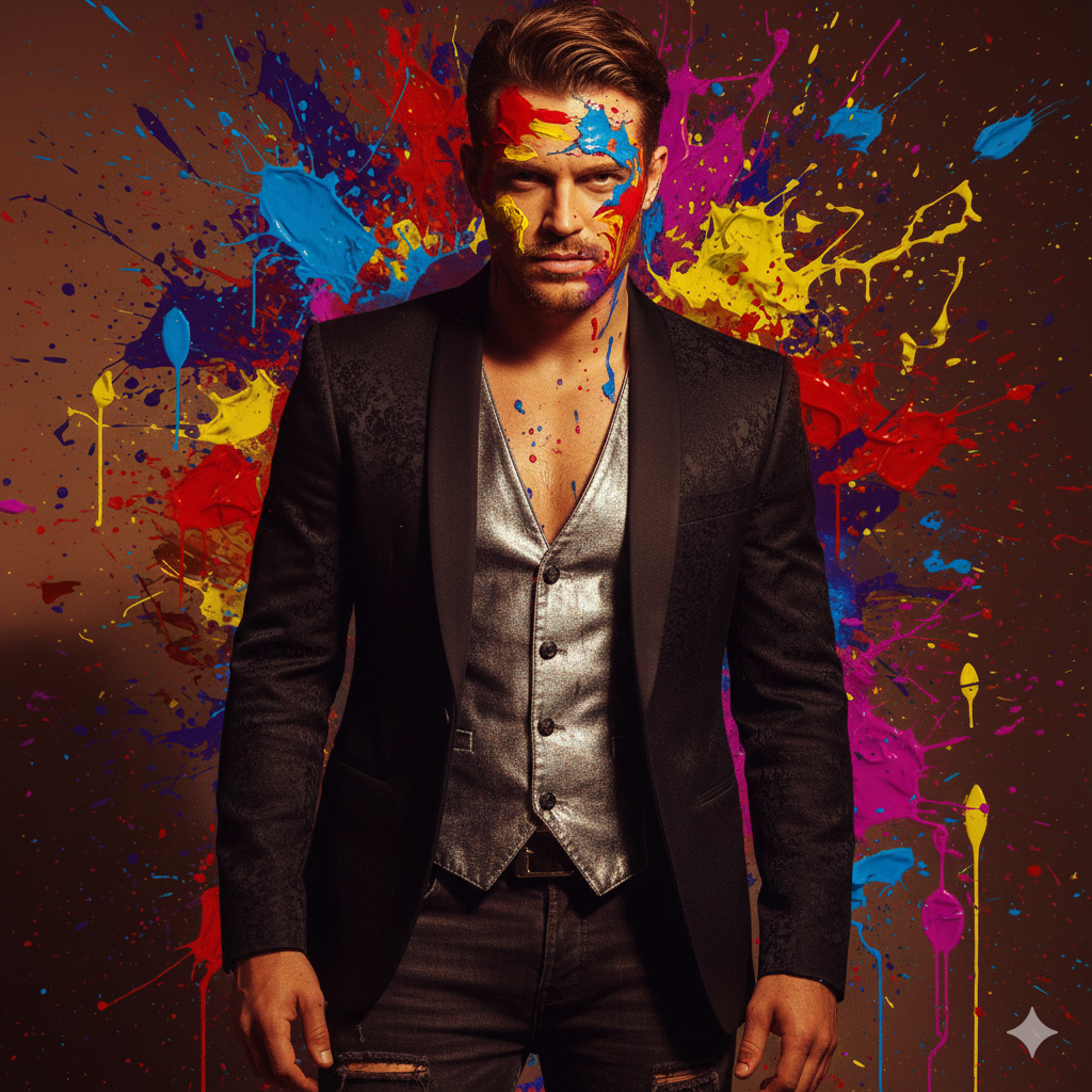 Artistic portrait with vibrant color splashes, abstract paint textures, expressive emotional styling, bold contrast, unique artistic background, ultra-HD high-impact creative look.