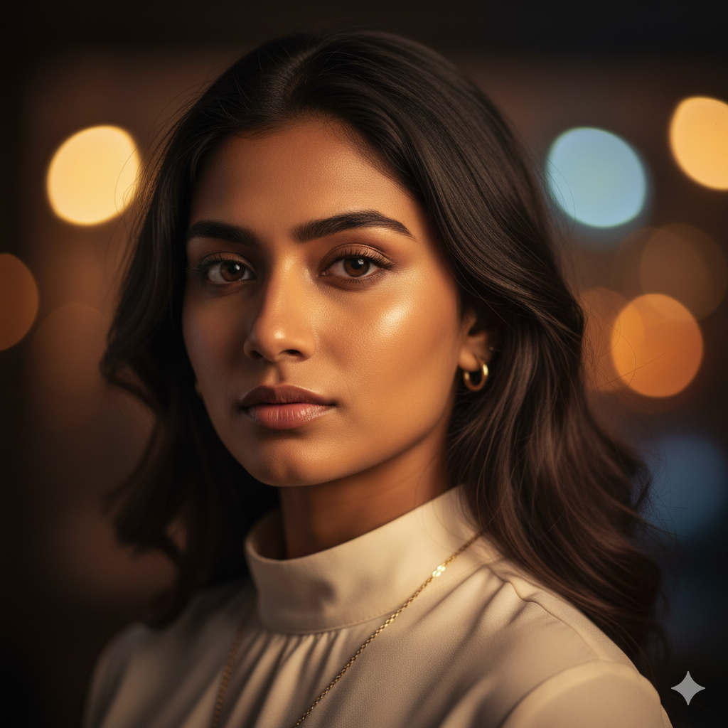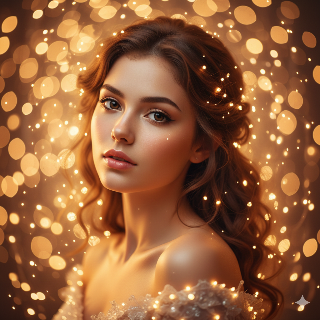 Dreamy portrait with sparkling bokeh lights, golden glow, soft blur effects, romantic warm tones, sharp eyes, smooth skin details, magical fairy-light aesthetic trending in 2025.