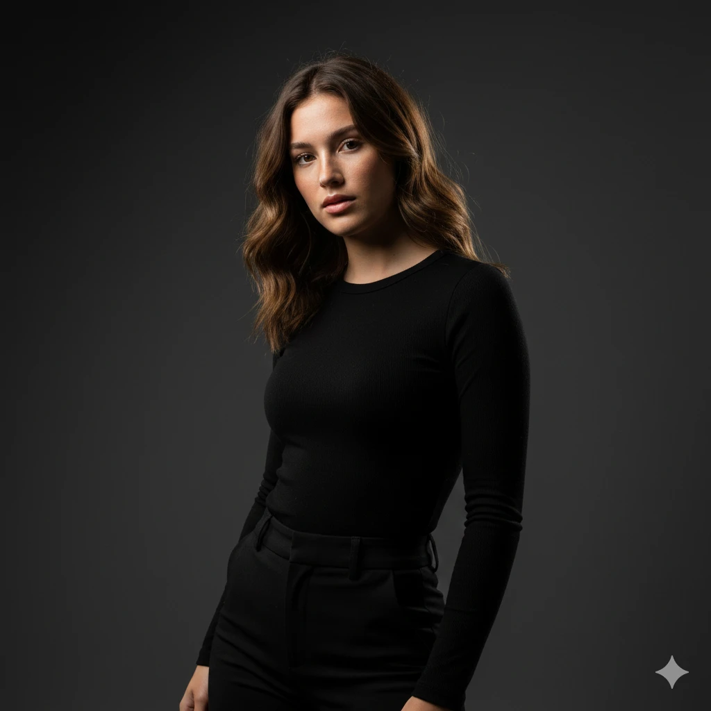 “A girl wearing black outfit, dramatic studio lighting, sharp details, professional photoshoot style”