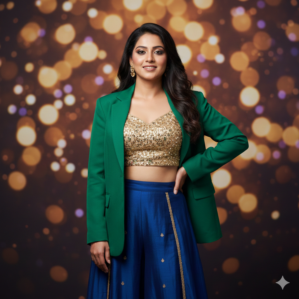 A confident Indian girl in an Indo-Western fusion outfit, blazer with crop top, soft glam makeup, party ambience with bokeh lights, cinematic portrait framing, 4K sharpness.