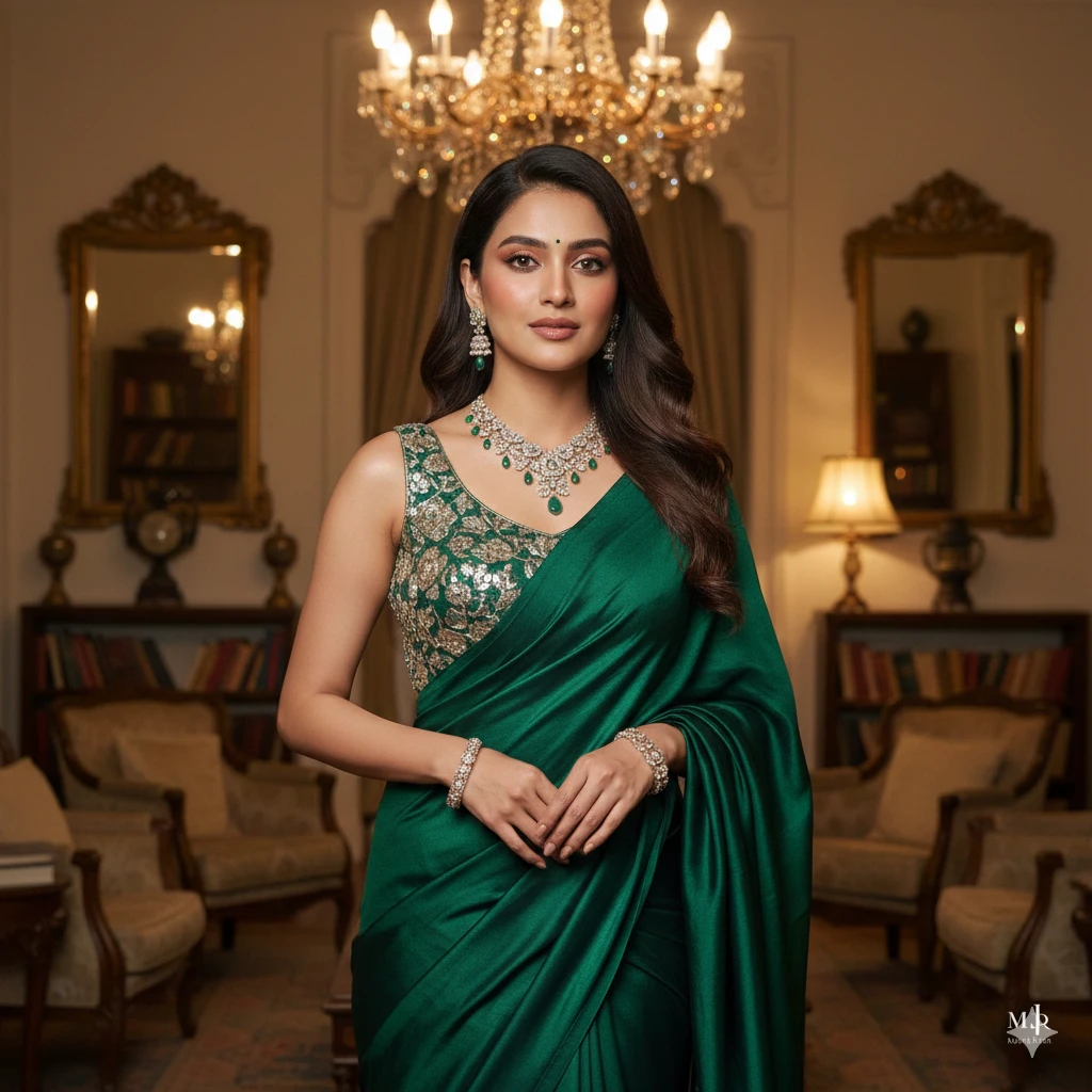 A beautiful Indian girl in a modern cocktail saree, subtle glossy makeup, wavy hair, warm indoor lighting, classy background decor, fashion-editorial aesthetic, highly detailed face and jewelry.