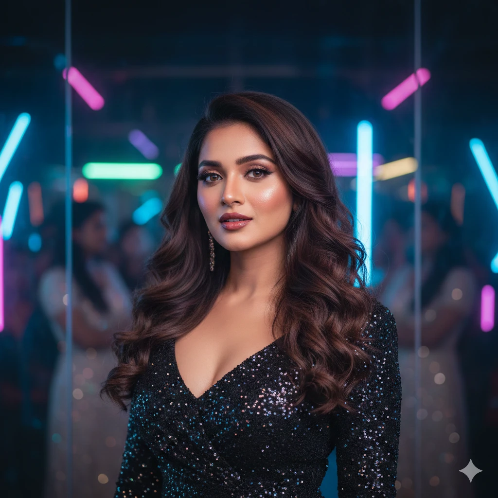 A stunning Indian girl in a glamorous night-party look, wearing a glittery black bodycon dress, soft curls, glowing makeup, neon party lights in the background, cinematic 4K style, ultra-realistic skin texture, confident expression.