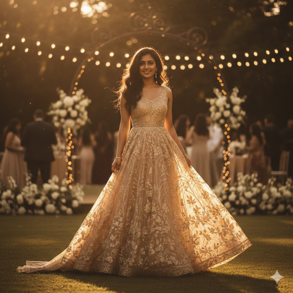An Indian girl in a shimmering golden gown, standing outdoors during golden hour, warm sunlight reflecting on hair, soft shadows, dreamy party vibe, natural glow.