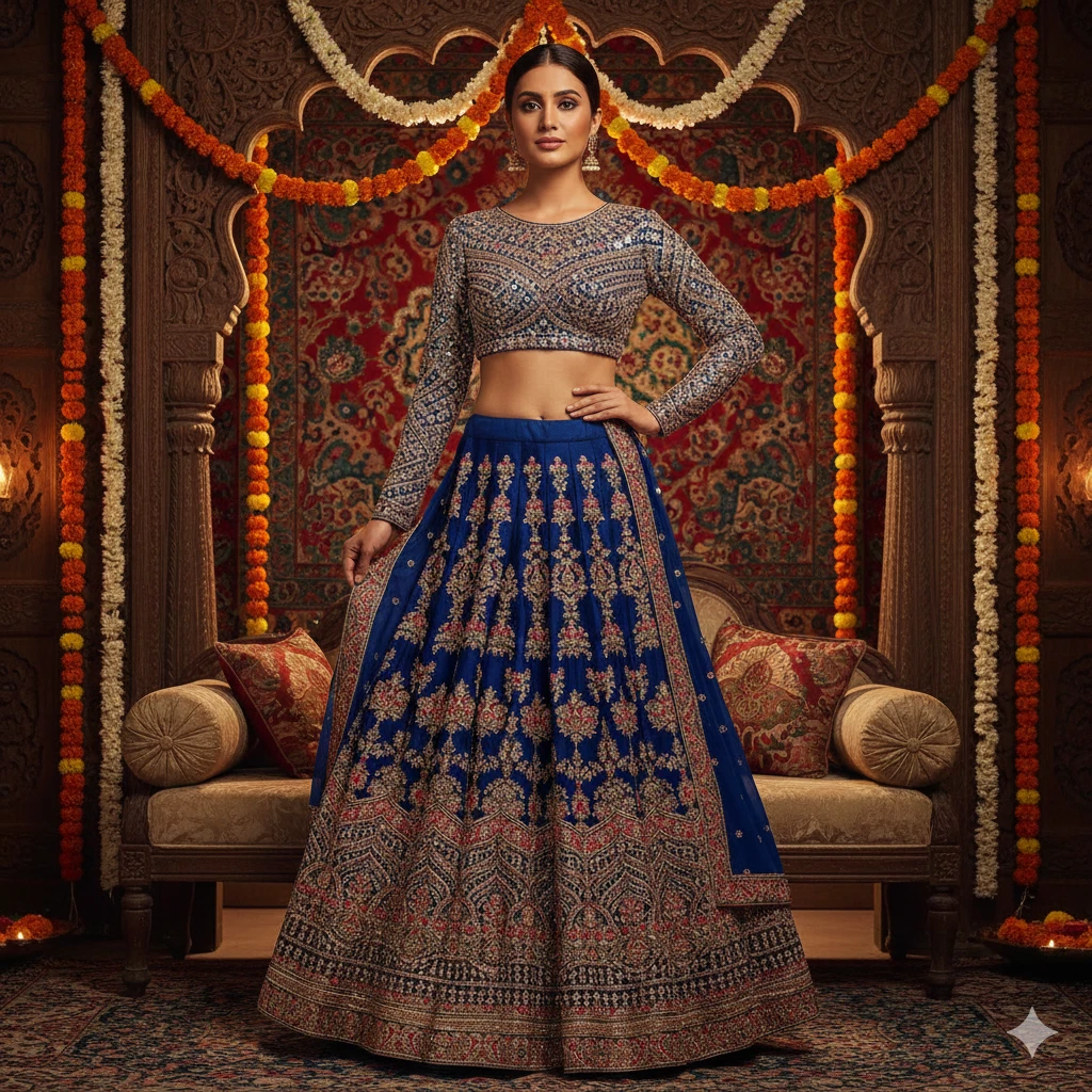 A stylish Indian girl wearing an embroidered lehenga with a designer blouse, soft festive lighting, natural skin tone, elegant pose, luxury backdrop, rich colors, ultra-HD detailing.